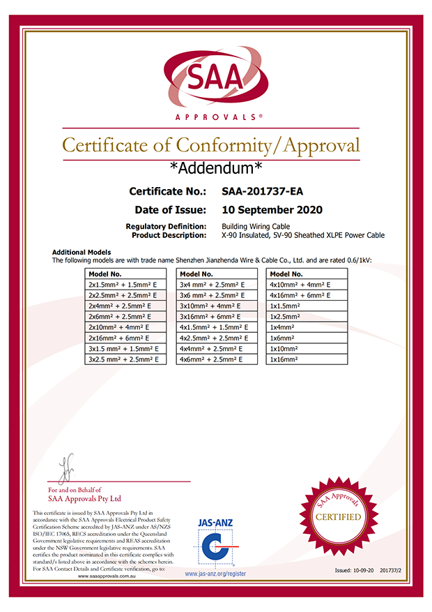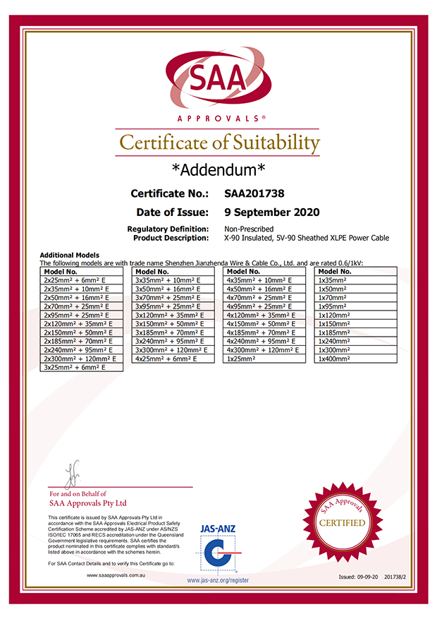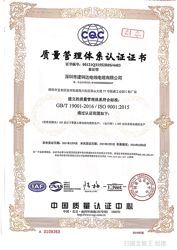 深圳建圳達(dá)電線電纜有限公司,成立于2000年,是一家電線電纜制造商,我們通過了世界各地不同市場的多數(shù)認(rèn)證,如:CCC、RoHS、CB、SAA、TUV、VDE、PSE、BPS、UL、CSA。我們根據(jù)定制產(chǎn)品不斷更新新的認(rèn)證。經(jīng)過數(shù)十年的發(fā)展,我們與來自世界各地的客戶建立了長期的合作關(guān)系。我們?cè)?jīng)是菲律賓機(jī)場,,柬埔寨的電力站,美國的醫(yī)院,工廠,埃塞俄比亞的水電站項(xiàng)目。我們是一家值得信賴的電線供應(yīng)商。
